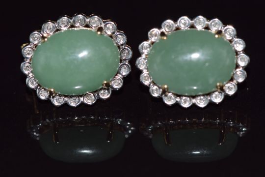 A pair of 9k gold earrings set with jade and diamonds, 8g
