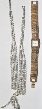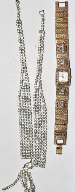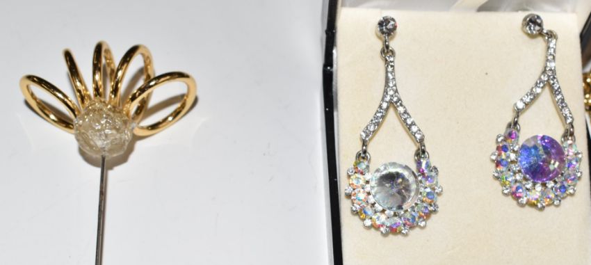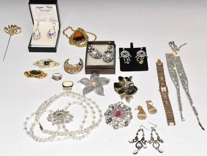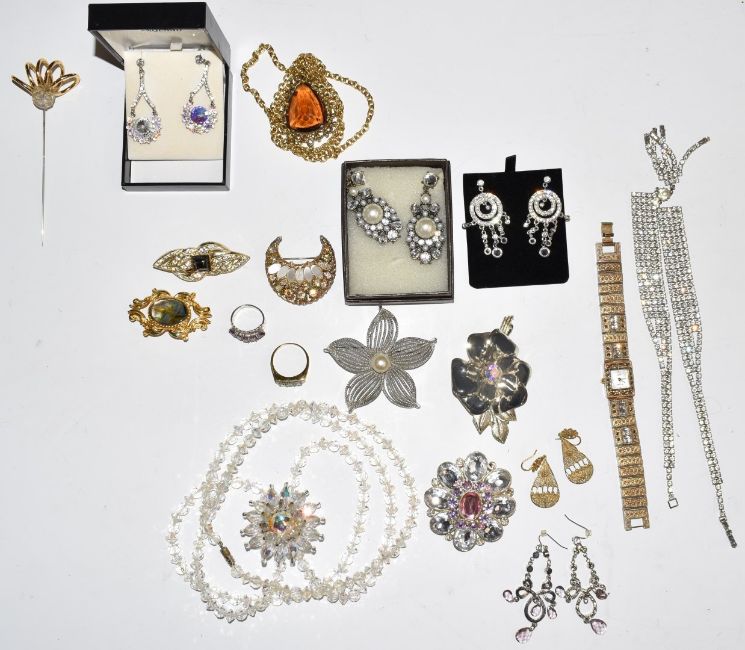 A collection of jewellery including Exquisite brooch, filigree earrings, silver ring, diamanté necklace, etc