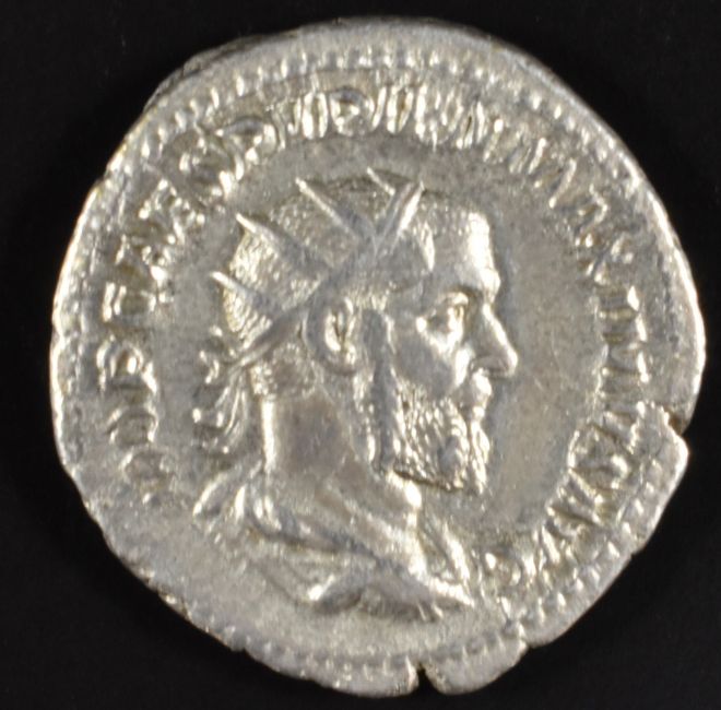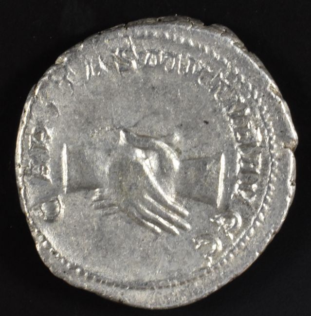 Roman Imperial coinage Military Anarchy AD235-270 Pupienus AD238 silver Antoninianus, diameter 21mm, obv radiate bust imp.caes,pupian max imp savg, rev caritas mvtva avgg, clasped hands, ex BMC, labelled one of three coins from hoard