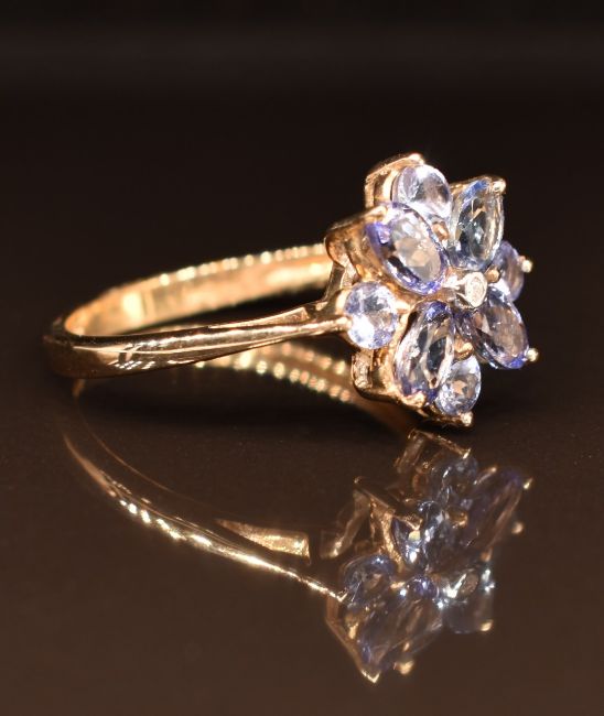 A 9ct gold ring set with a diamond and tanzanites, 2.6g, size N