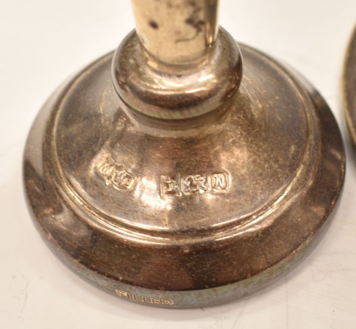 Hallmarked silver items comprising candlestick, smaller pair of candlesticks, two trumpet vases and a silver mounted Book of Common Prayer