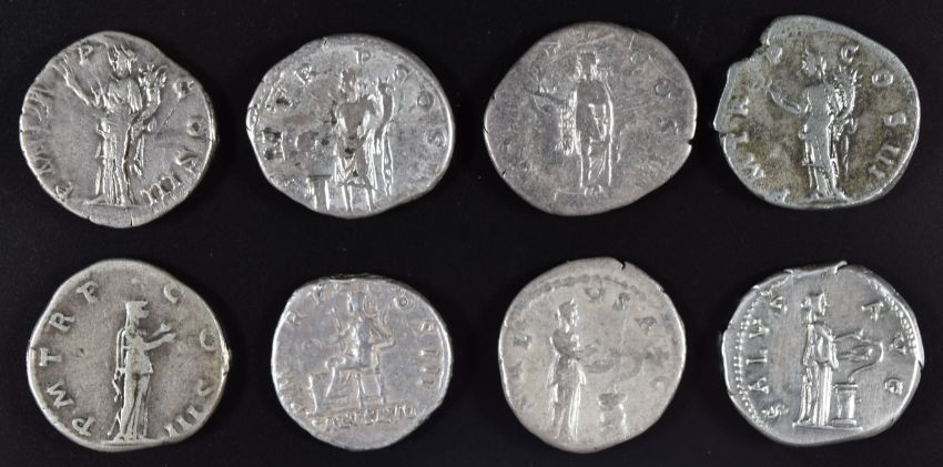 Roman Imperial coinage Adoptive Emperors AD96-138 Hadrian eight silver Denarius, various reverses, diameter 17-18mm