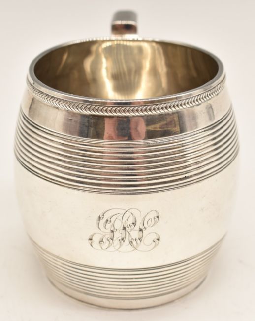 Georgian hallmarked silver barrel shaped christening cup or small beaker, London 1815, maker's mark rubbed, height 7cm, weight 128g