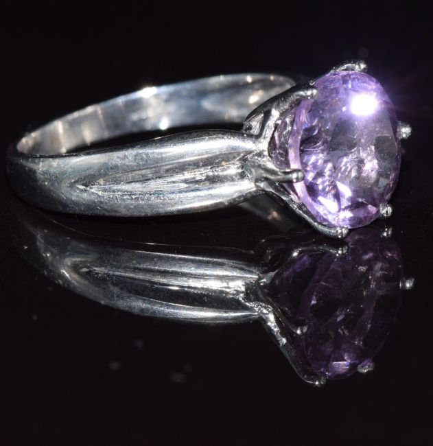 A 9k white gold ring set with a round cut amethyst, 4.6g, size Q