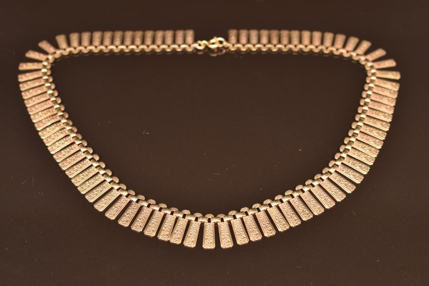 A 9ct gold Cleopatra style necklace made up of textured links, 18.4g, 38cm long