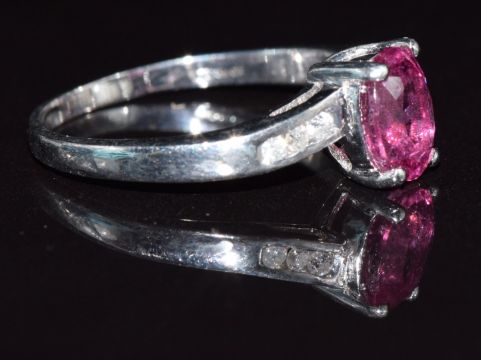 A 9k white gold ring set with an oval cut rubellite and diamonds, 2.9g, size Q