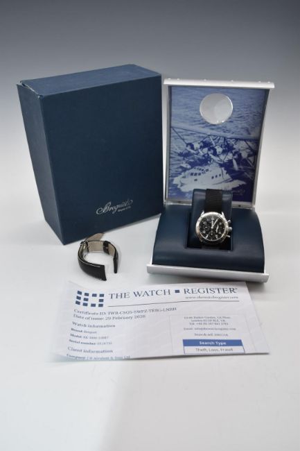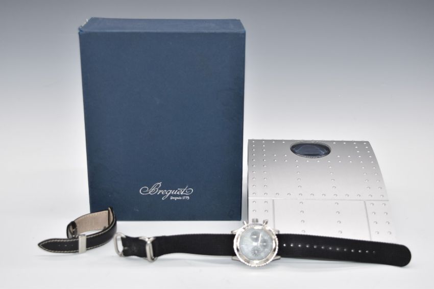 Breguet Aeronavale Type XX gentleman's automatic chronograph wristwatch ref. 3800 with luminous hands and Arabic numerals, black dial, rotating bezel, lollipop centre seconds hand, stainless steel case and signed 25 jewel calibre 582 movement, on NATO style canvas strap, case diameter 39mm, serial number 53087, in original box with original leather bracelet and clasp, related paperwork and outer box.
