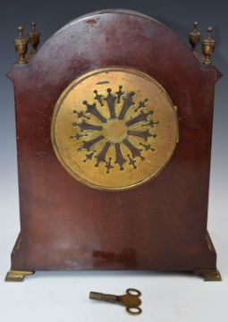 Inlaid mahogany two train mantel clock with white enamel dial, striking on a gong, H28.5cm
