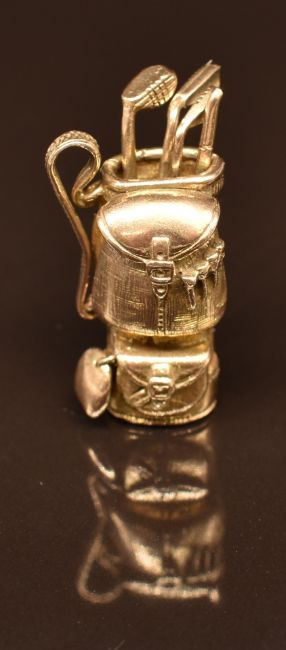 A 9ct gold charm in the form of a golf bag and clubs, 9.4g