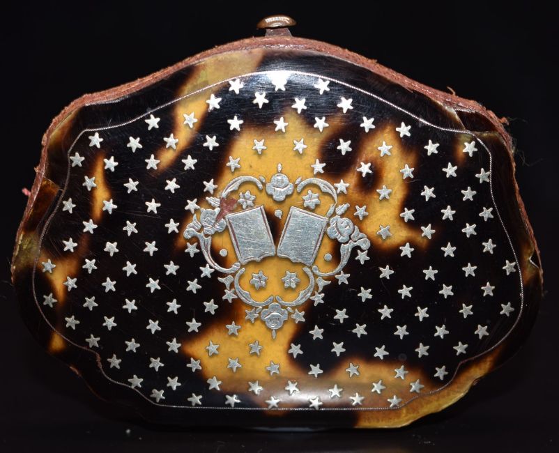 Late 19th/early 20thC French silver inlaid piqué purse decorated with stars/vacant cartouche, with pink silk lining, 6 x 8cm