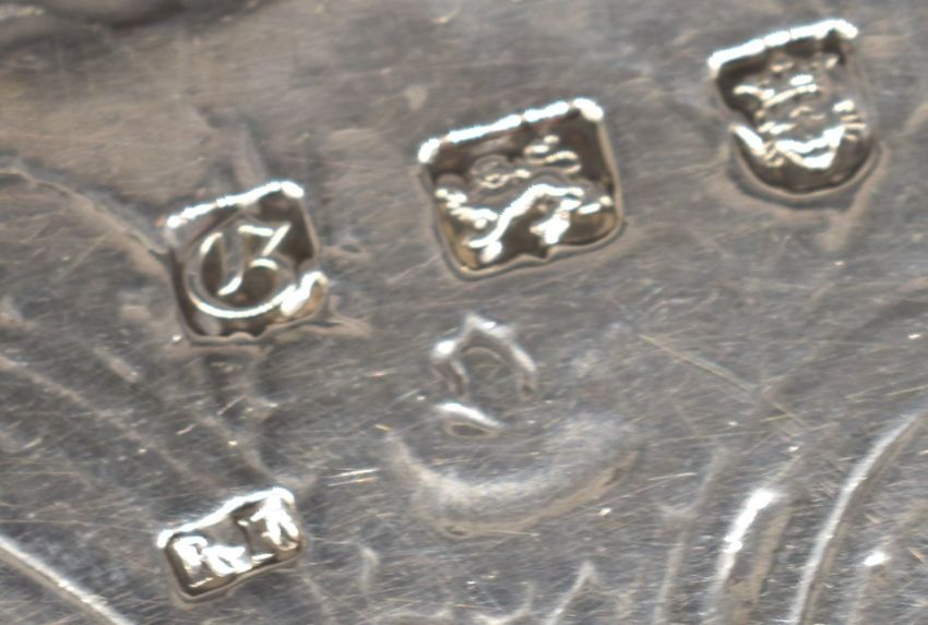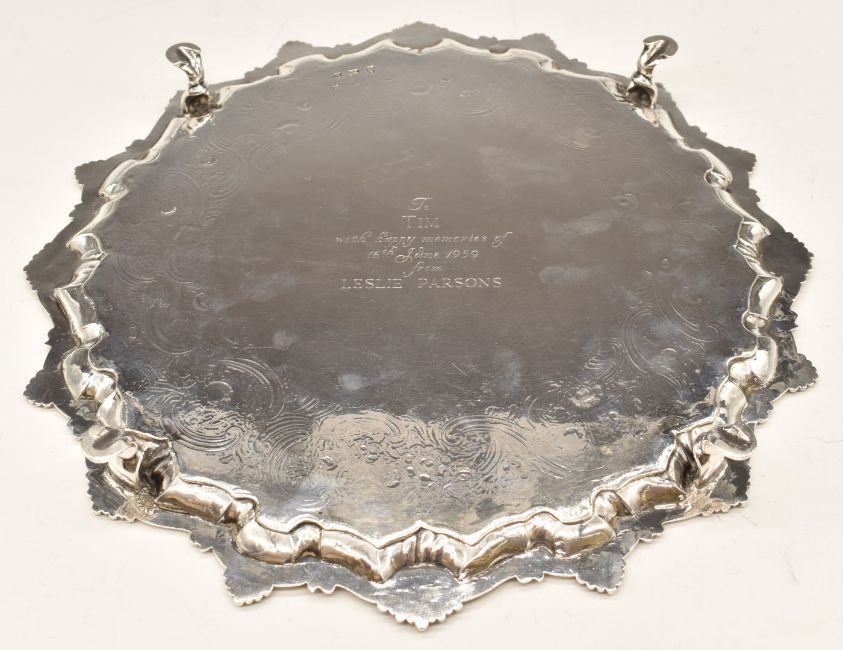 Georgian hallmarked silver salver with shaped edge and engraved decoration, raised on four feet, London 1762, maker Richard Rugg I, diameter 37cm, weight 1161g