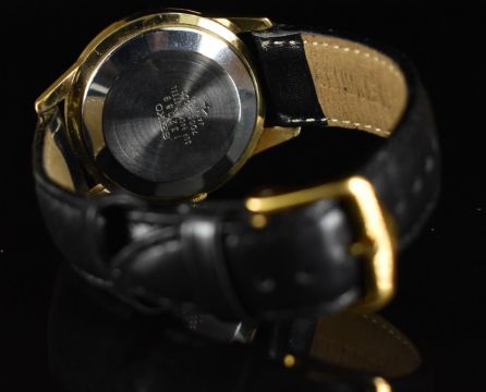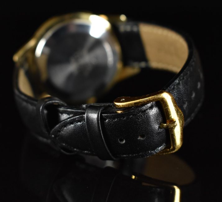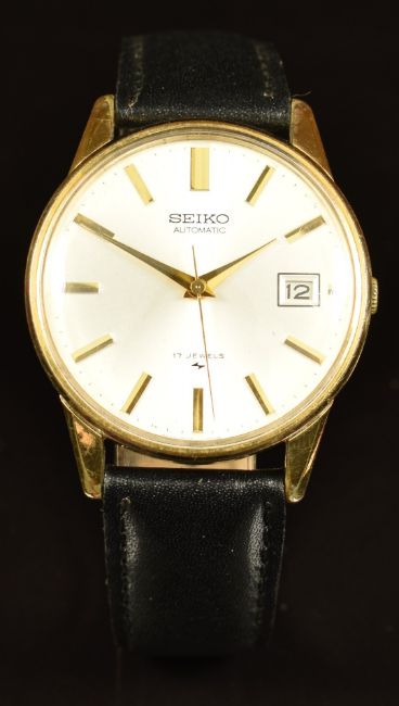 Seiko gentleman's automatic wristwatch ref. 7005-2000 with date aperture, gold Dauphine hands and baton hour markers, silver dial, gold plated case and signed 17 jewel calibre 7005 movement, on black leather strap, case diameter 36mm, serial number 132089.