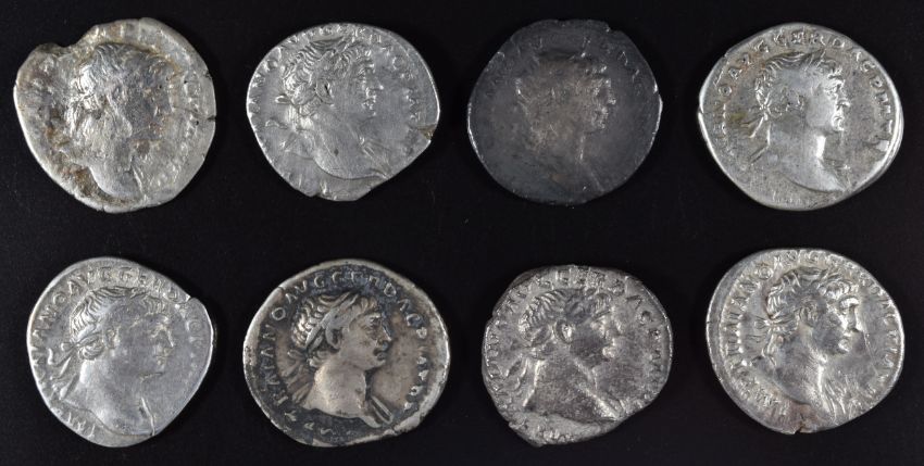 Roman Imperial coinage Adoptive Emperors AD96-138 Trajan eight silver Denarius, various reverses, includes a Chepstow metal detector find, diameter 17-18mm