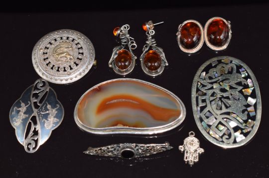 Two pairs of silver earrings set with pressed amber, silver brooch set with agate, Siam brooch, etc