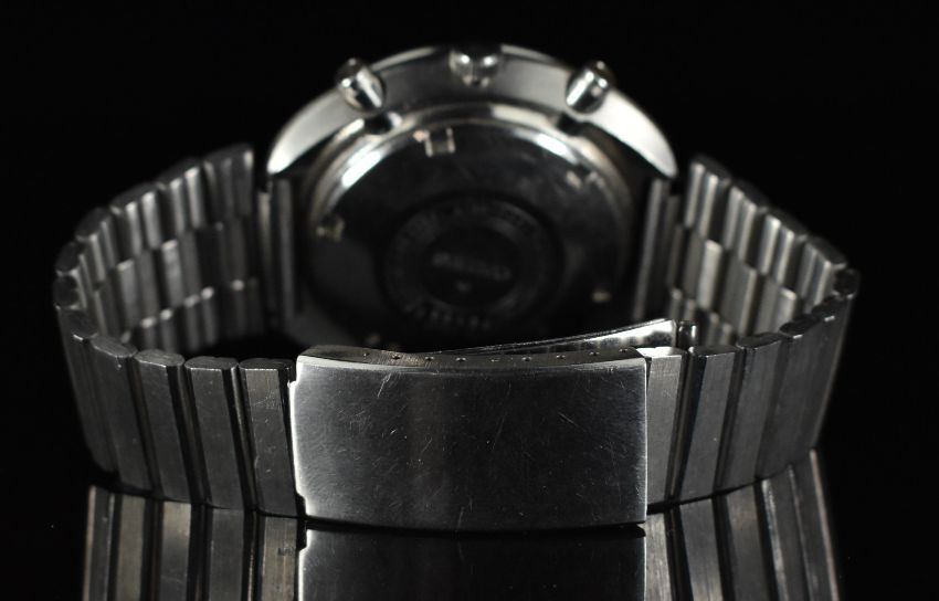 Seiko 'UFO' gentleman's automatic chronograph wristwatch ref. 6138-0011 with day and date aperture, silver subsidiary dials, yellow centre seconds hand, black dial, black and red bezel, stainless steel case and signed calibre 6138 movement, on stainless steel bracelet, case diameter 44mm, serial number 236439.