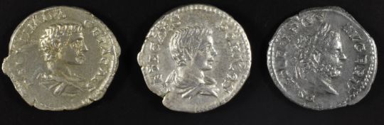 Roman Imperial coinage The Severan Dynasty AD193-235 Geta three silver Denarius, various reverses Providence, Janus and Geta, diameter 18mm