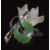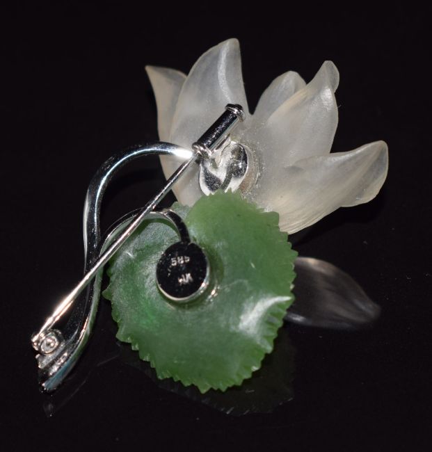 A 14k white gold brooch in the form of a lily set with nephrite jade, quartz, rubies and a diamond, 13.8g, 4.8cm