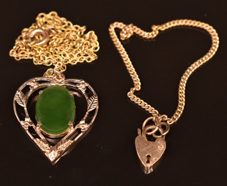 A 9ct gold bracelet and 9ct gold heart pendant set with nephrite jade, 5g