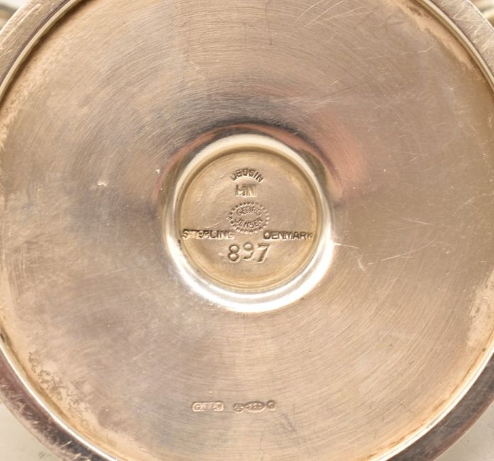 Set of three Georg Jensen hallmarked silver squat candlesticks, design number 897, marked Georg Jensen and with import marks for London 1958, diameter 6.5cm, weight 121g