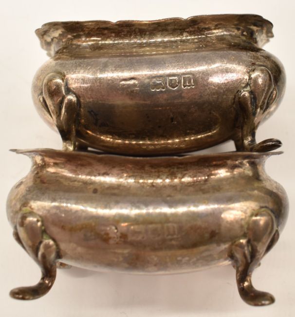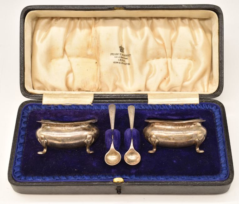 Edward VII cased hallmarked silver cruet set comprising two salts and spoons, London 1908, maker's marks rubbed, the case marked Pearce & Sons Ltd, weight 56g, width of case 19cm