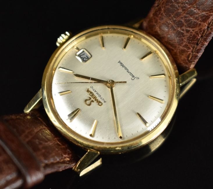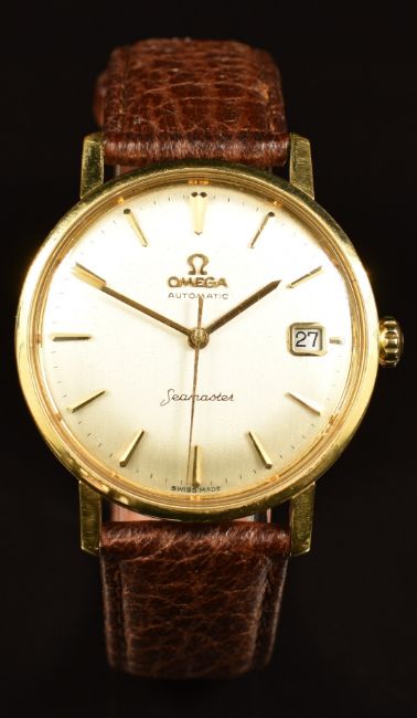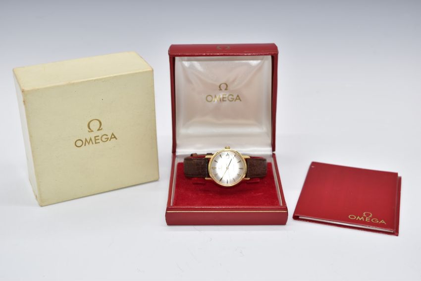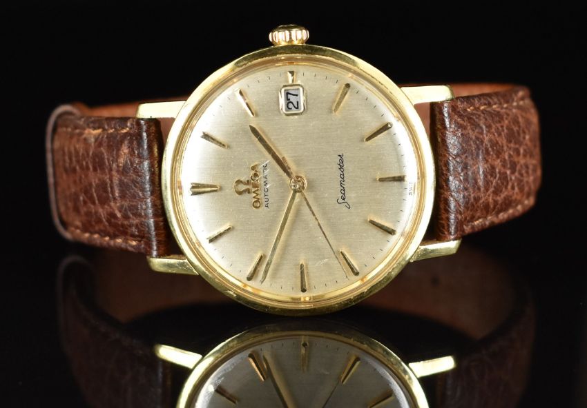 Omega Seamaster 18ct gold gentleman's automatic wristwatch ref. 14770 with date aperture, gold hands and baton hour markers, silver dial and signed calibre 562 movement, on brown leather strap, case diameter 34mm, serial number 18587282, in original both with outer card box, international guarantee, instructions and documents wallet.