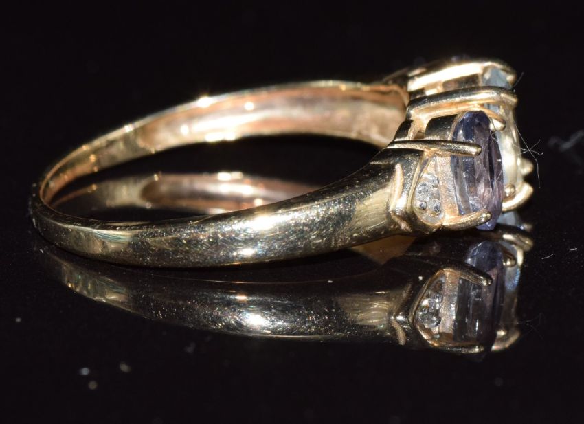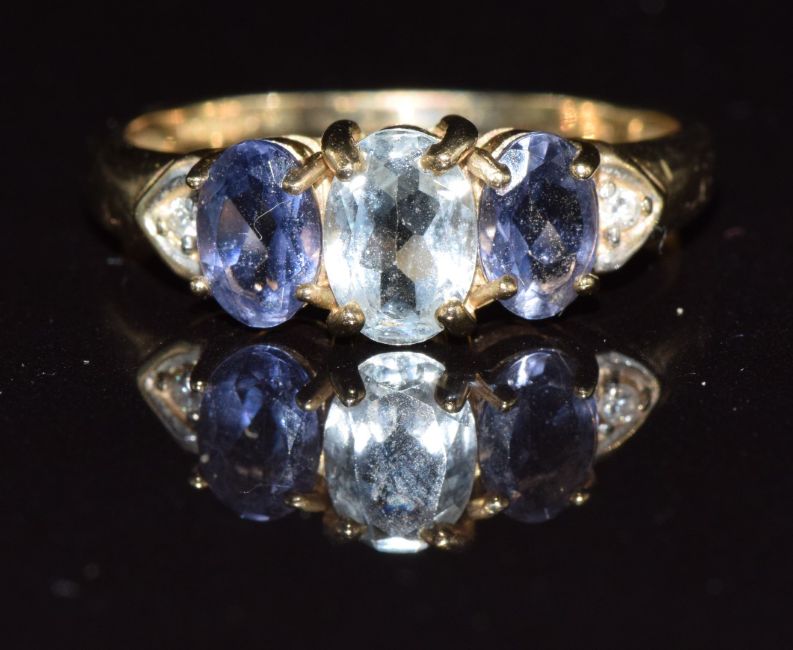 A 9k gold ring set with an oval cut aquamarine, iolite and diamonds, 2.5g, size Q