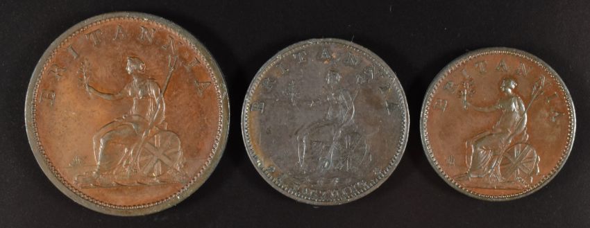 Three copper coins of George III comprising an 1806 farthing and halfpenny and a 1799 farthing (all EF/GEF)