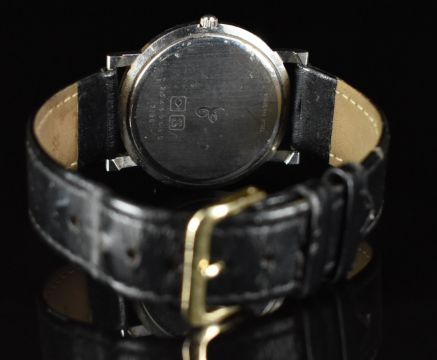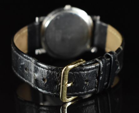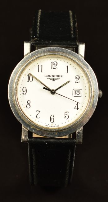 Longines gentleman's wristwatch ref. 7185 with date aperture, silver hands, black Arabic numerals, white dial, stainless steel case and quartz movement, on black leather strap, case diameter 34mm, serial number 25450690.