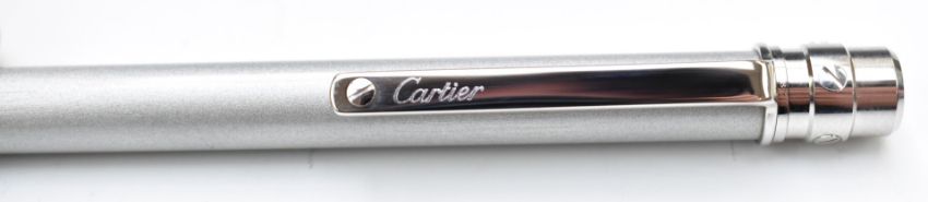 Cartier propelling ballpoint pen with brushed silver finish, in case, box and with instruction booklet