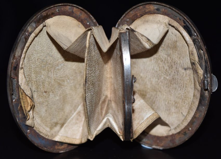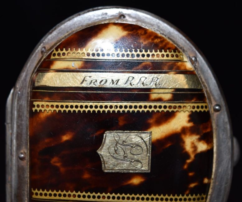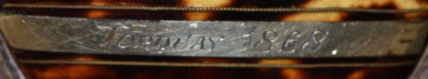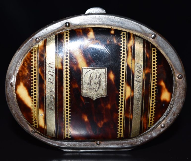 Late 19th/early 20thC French gold inlaid metal bound piqué purse with banded decoration and inscription 'From RRR Torquay 1868', with fitted interior