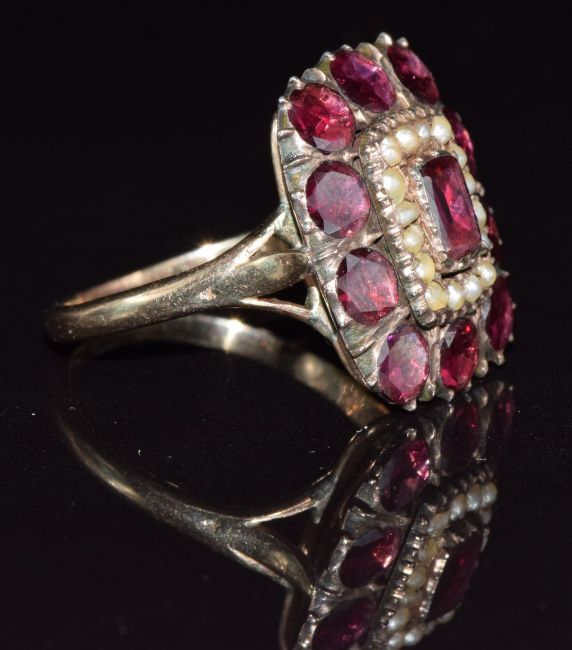 Victorian ring set with foiled garnets and seed pearls, 4.8g, size P
