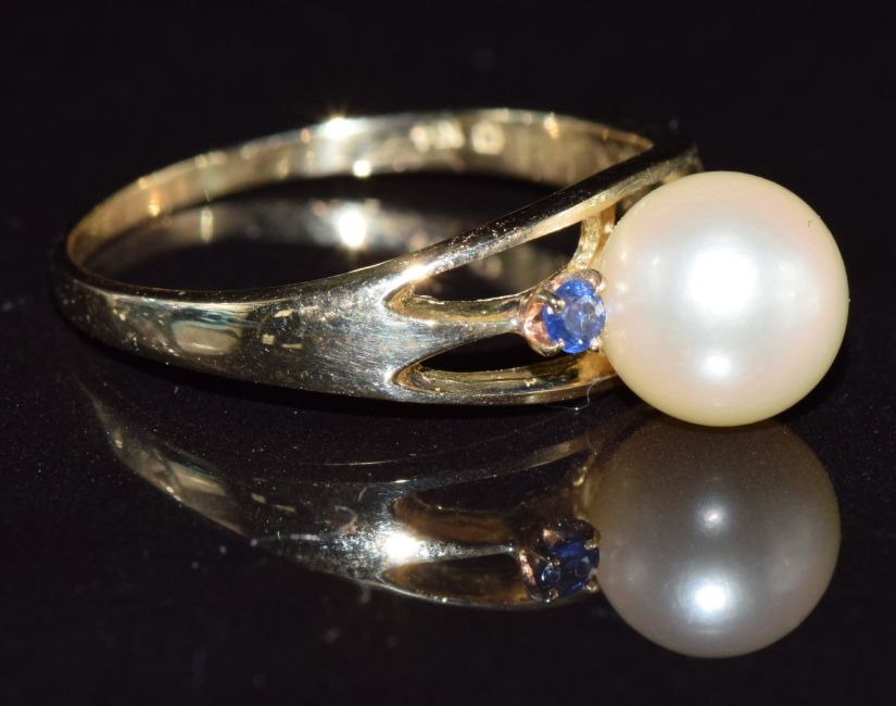 A 14k gold ring set with a pearl and sapphires, 2.9g, size O