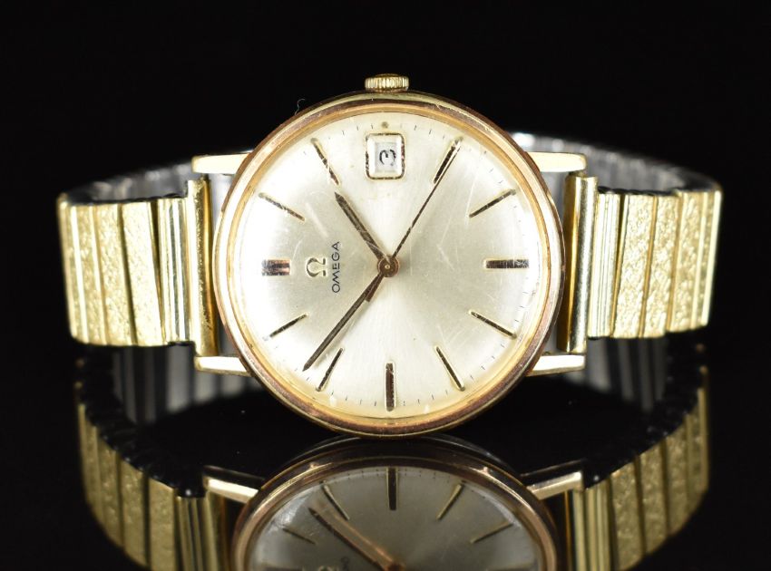 Omega gentleman's wristwatch ref. 132.019 with date aperture, gold hands and hour markers, silver dial, gold plated case and signed 17 jewel calibre 611 movement, on expanding metal bracelet, case diameter 34mm, serial number 23713692.