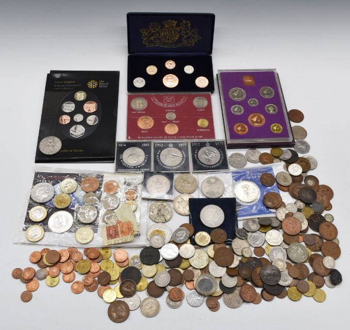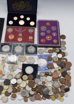 An amateur collection of UK and overseas coinage, Queen Victoria onwards, some silver content including £5 examples, Royal Mint  and other coin sets 1953 onwards, collectable £2 etc