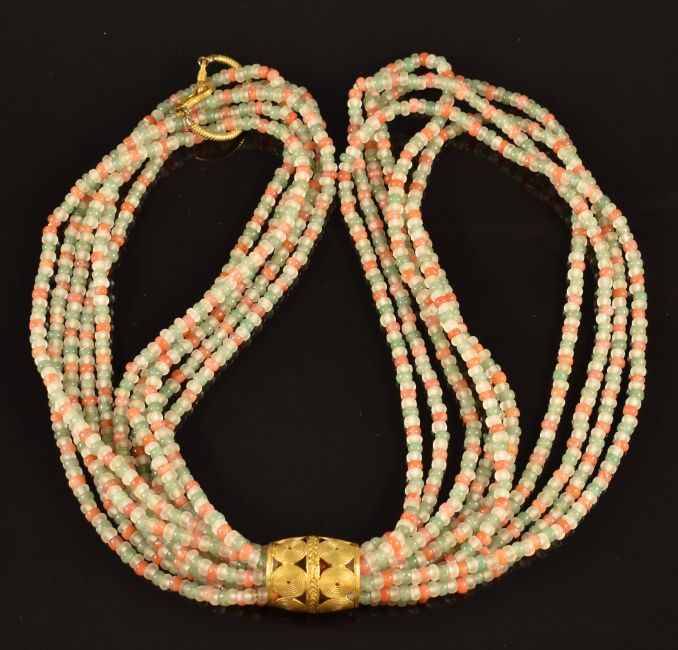 Galeria Cano gold plated and beaded Colombian artefact necklace of agate beads with a 24k gold plated slider and clasp