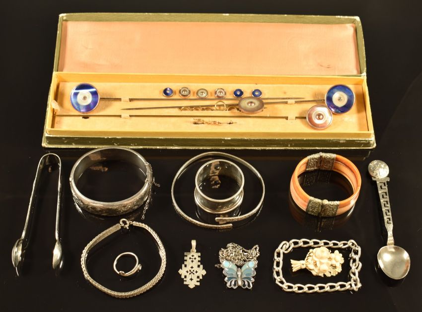 A set of hat pins, three silver bangles, silver butterfly necklace, silver tongs, silver napkin ring, ivory bangle etc