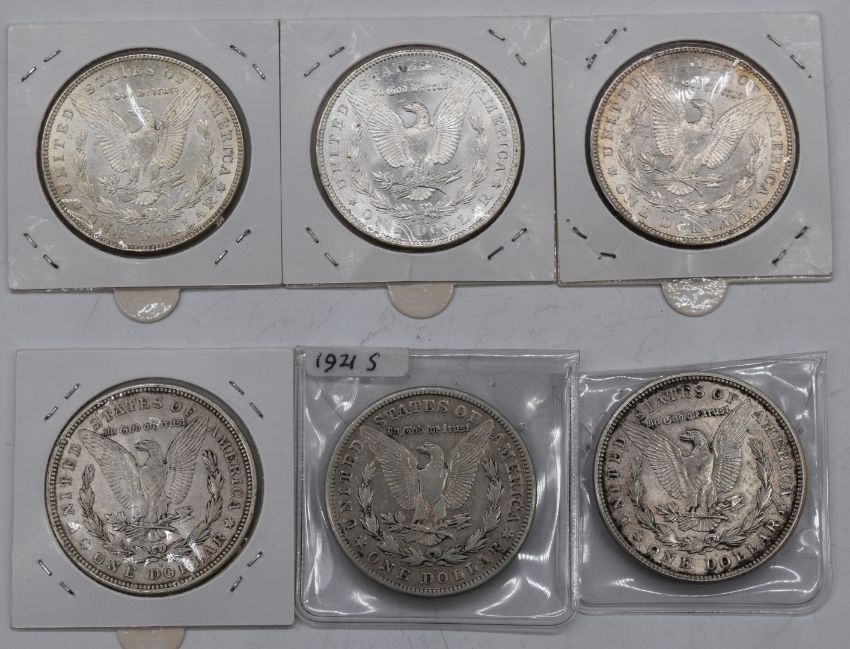 Six USA Morgan silver Dollars comprising 1901, 1902 and 1904 New Orleans and three 1921 examples including Denver and San Francisco