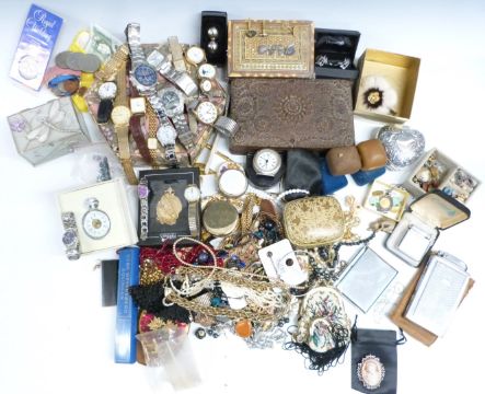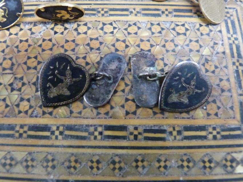 A collection of costume jewellery including beads, watches, Siam cufflinks, carved box, etc