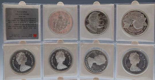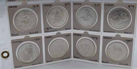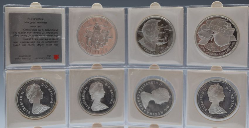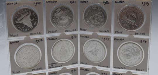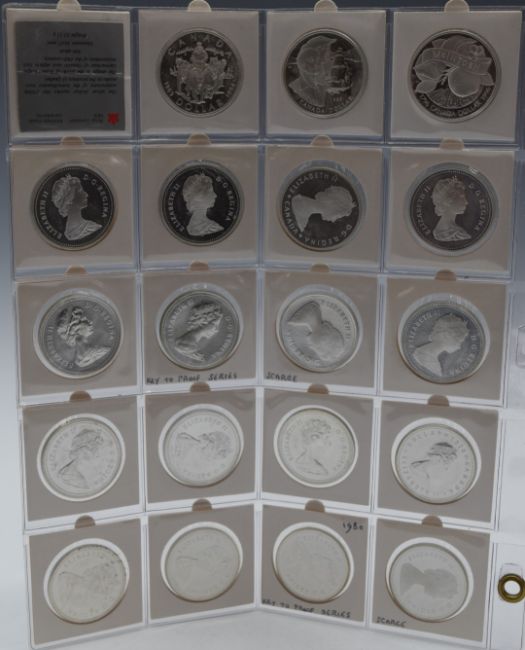 A collection of twenty various Canada silver Dollars in an album page, 1967-1996, including proof examples