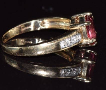 A 9k gold ring set with an oval cut red topaz and diamonds, 3.1g, size Q