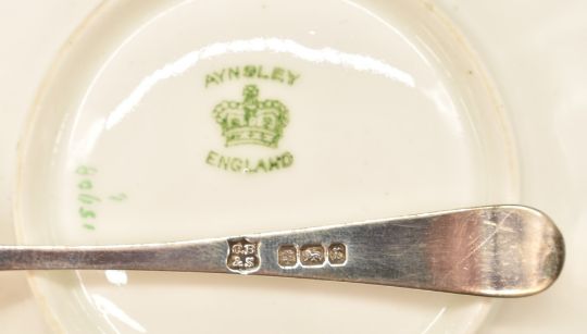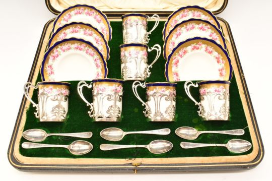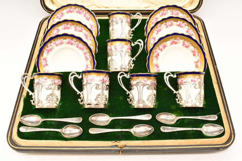 Aynsley porcelain cased set of six coffee cans decorated with roses in hallmarked silver holders with corresponding teaspoons, Sheffield 1909, maker Cooper Brothers & Sons Ltd, weight of silver 276g, width of case 38cm
