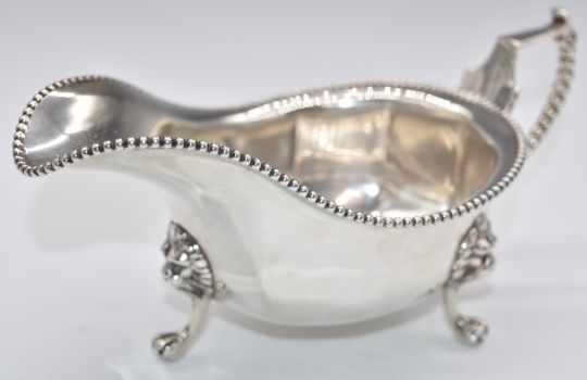 George V hallmarked silver sauce boat with beaded edge and lion mask supports to legs, London 1915, maker Horace Woodward & Co Ltd, length 19.5cm, weight 290g