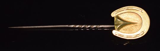 Victorian yellow metal stick pin in the form of a horseshoe verso a locket compartment, 4.8g, 8cm long