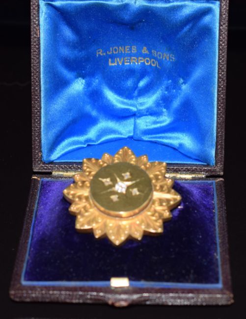 Victorian yellow metal brooch set with an old cut diamond of approximately 0.2ct and four smaller rose cut diamonds, verso a locket compartment set with a photograph, in original R.Jones & Sons box, 11.8g, 3.8cm