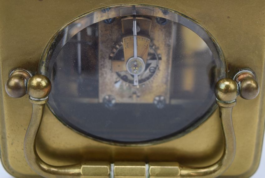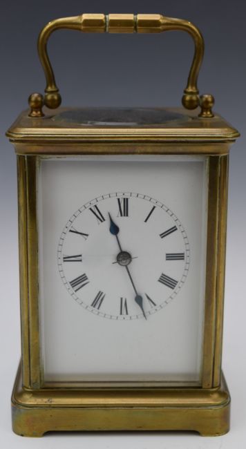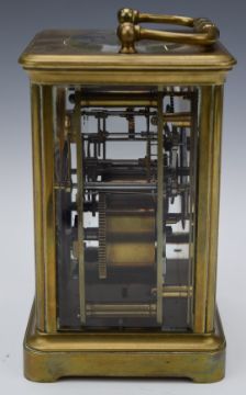 Brass cased carriage clock with white enamel dial and two train movement striking on a gong, H17.5cm