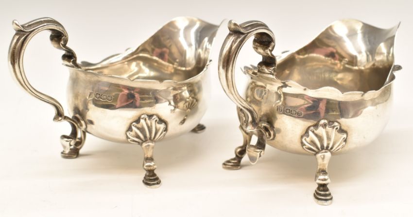 Pair of George V hallmarked silver sauce boats with shaped edges and scrolling handles, raised on three feet, Sheffield 1924, maker Thomas Bradbury & Sons Ltd, length 17cm, weight 467g