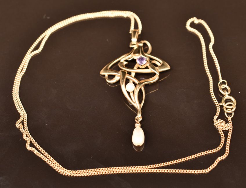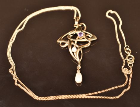 A 9ct gold Art Nouveau style pendant set with an amethyst and pearls, with chain, 4.4g