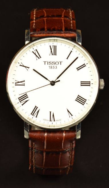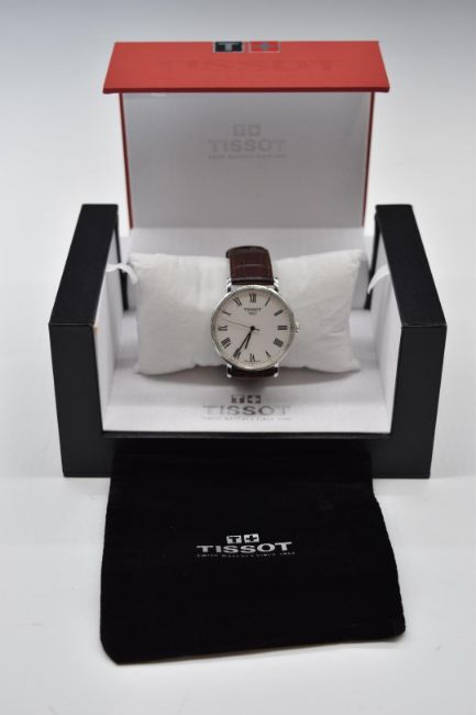 Tissot Everytime gentleman's wristwatch ref. T-109410 with black Roman numerals, silver dial, stainless steel case and quartz movement, on brown leather strap, case diameter 33mm, serial number FUP KJ9 6PP, in original box.