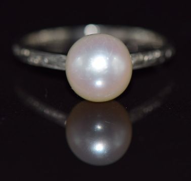 A 9ct white gold ring set with a pearl, 1.8g, size K