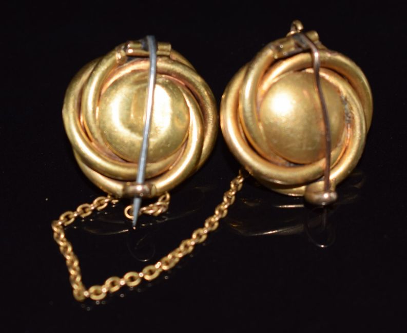 Victorian matching pair of knotted brooches/ cloak pins set with split pearls and blue enamel, 2.2cm